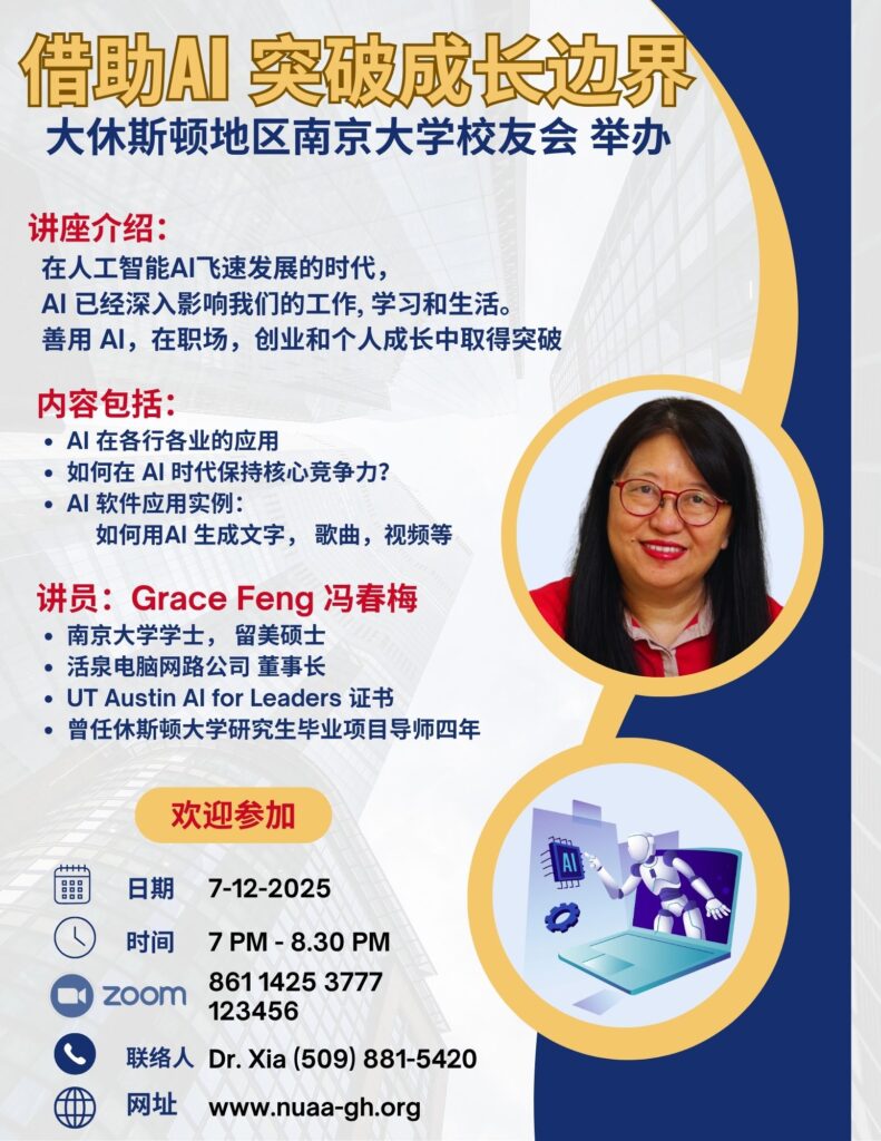 借助AI, 突破成长边界, 讲员 冯春梅, 7/12/2025, 7:00-8:30PM